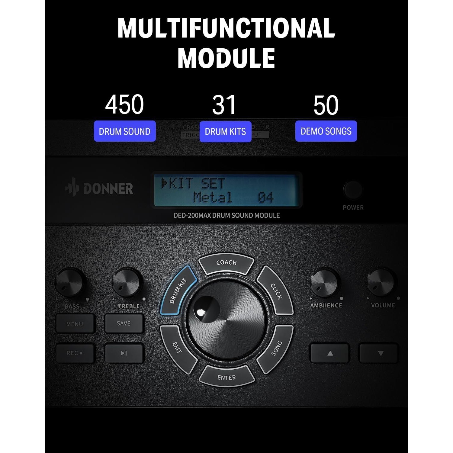 DED-200 MAX elektronik davul seti, gerçek davul kabuğunu ve gerçek davul metal kasnaklarını taklit ederek üstün bir görsel deneyim ve kullanıcı hissi sunar.